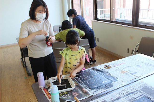今回は木版画を初めて体験する子どもたちが多かったので、初めの説明で彫刻刀の種類や注意点などを説明させていただきました。こういう時に安全面で同伴者のお父さん、お母さんがいてくれて本当に助かりました。