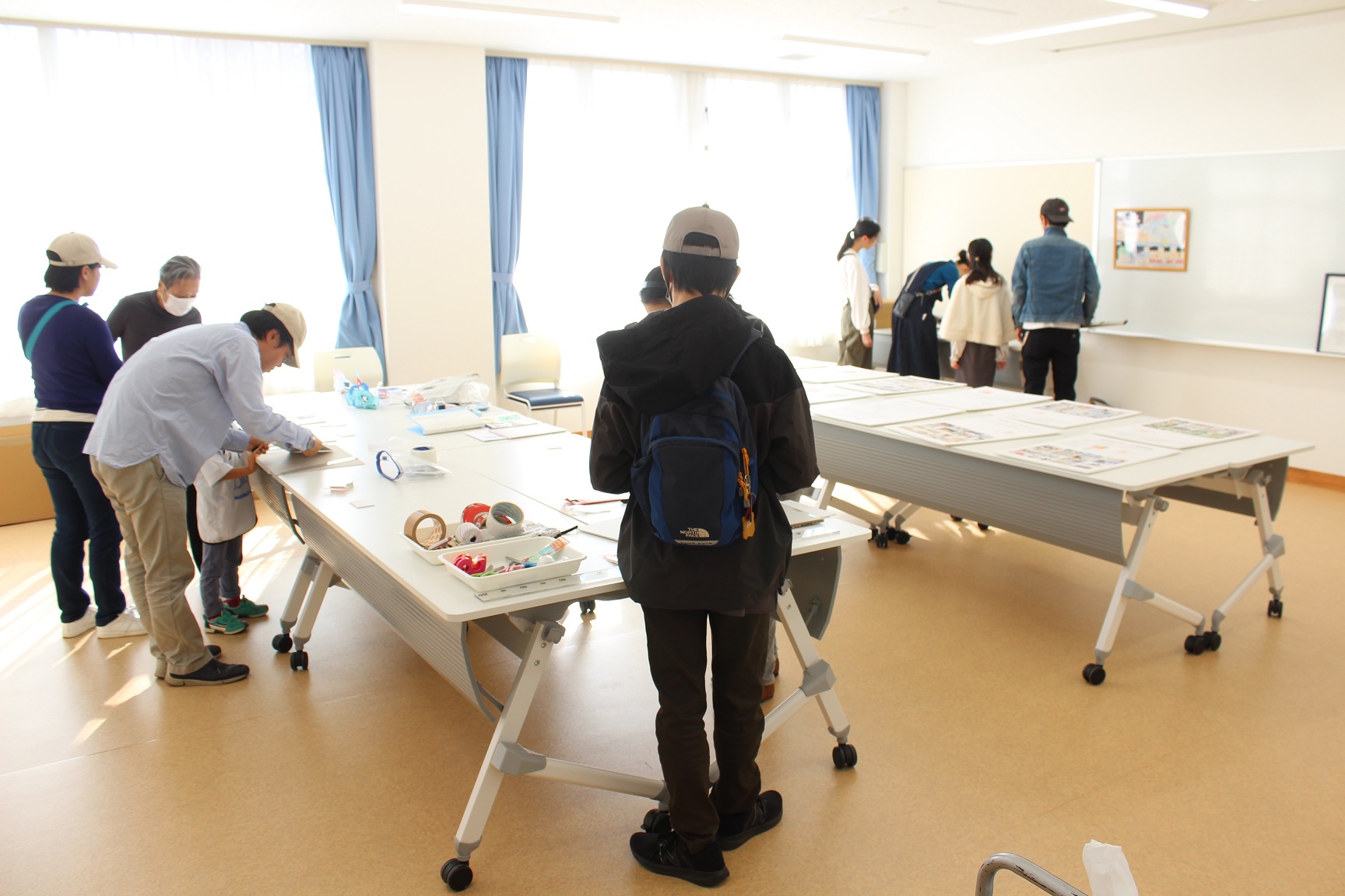当日の11時に私は会場入りし、テーブルや床の掃除を行った後、12時に参加アーティストの皆さんが集い、テーブルに各自の作品を置いてみてから、私の方で「絵画であればコチラの壁があります。」「立体作品であればコチラのテーブルはどうでしょうか」などお伝えし、簡単な作品の展示の仕方のポイント(ひっつきむしで壁に絵画作品を留めたり、水平棒で測ったり。あと自己紹介パネルやキャプションの書き方など)を話しただけで、あとは各アーティストの皆さんがオープン13時までの1時間で自由に設置することができました。