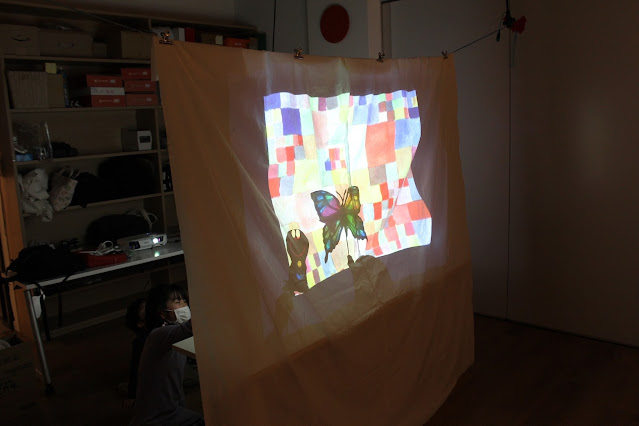 蝶々の型をうまく写して、お母さんと一緒に上手に切り抜いたモチーフにカラーセロハンやペンで彩り、光の下ではモチーフがきれいに見えなかったけど、影絵の中では美しく見えたことを発見した男の子!